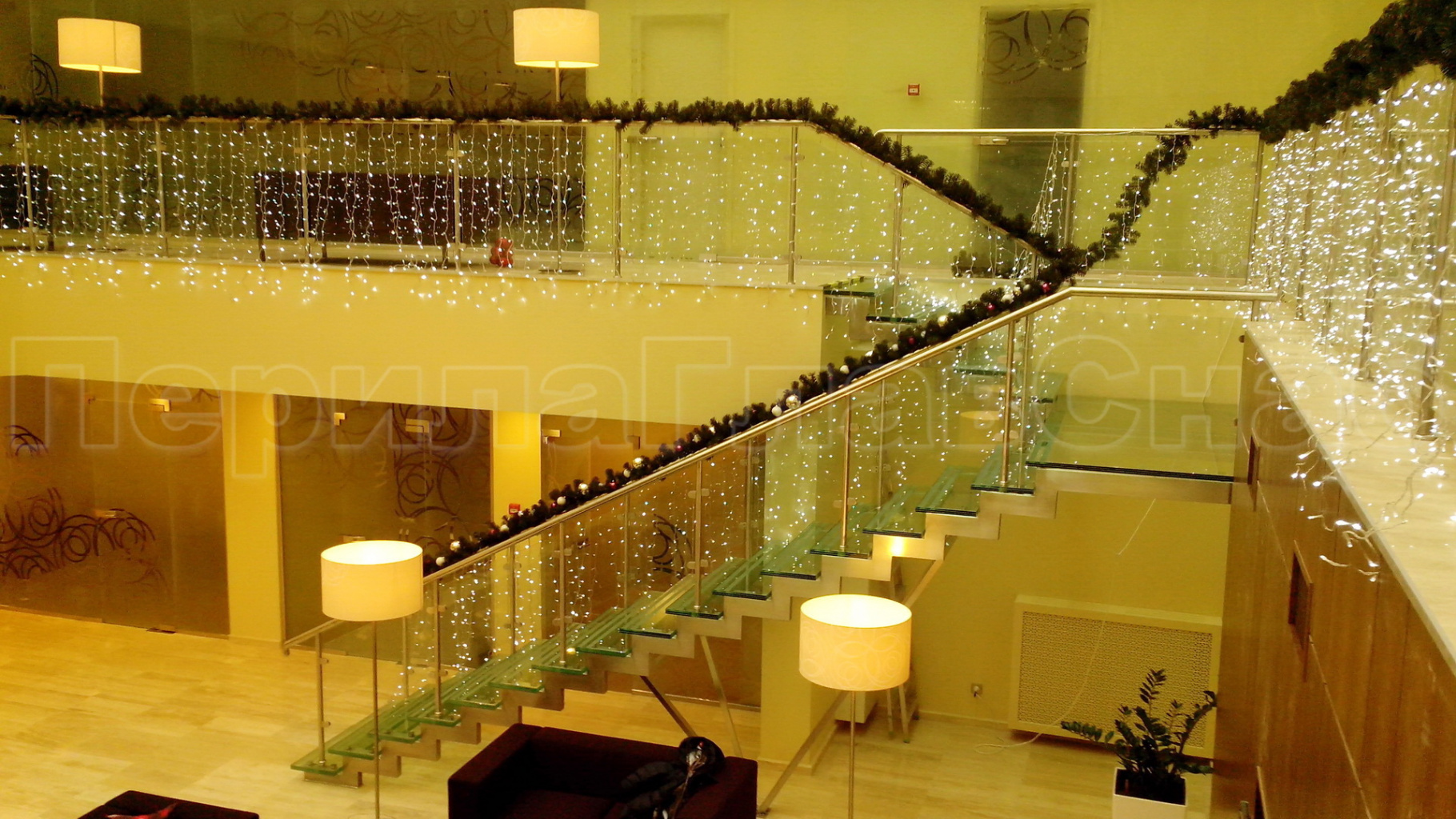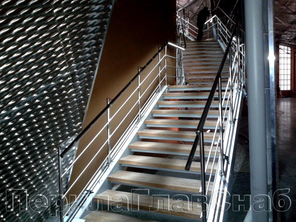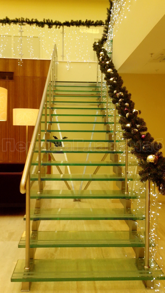 Ограждения лестниц на несущем стекле с подсветкой в Казани. Готовые проекты ПерилаГлавСнаб