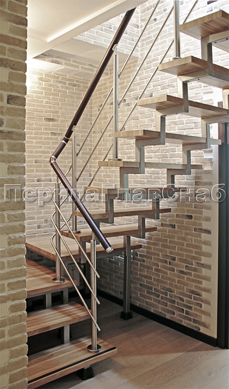Ограждение лестницы на квадратных стойках с латунным поручнем в Казани. Готовые проекты ПерилаГлавСнаб