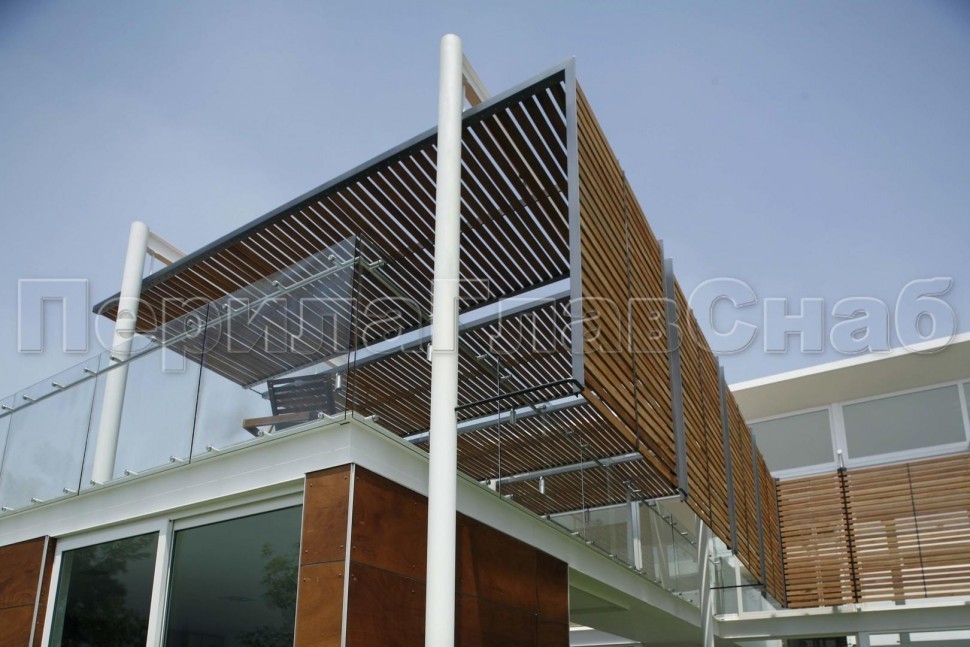 Ограждение с деревянным поручнем с зажимными стеклодержателями и стойками
