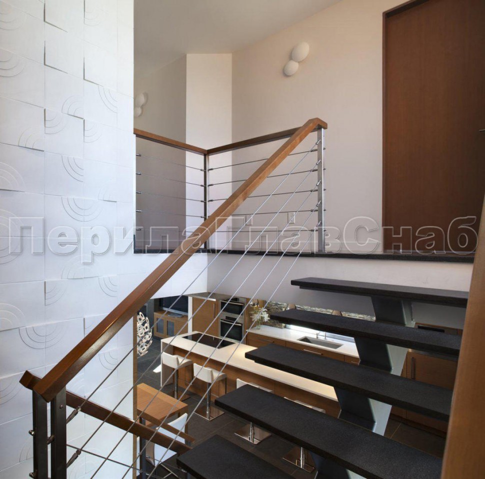 Нержавеющие ограждения без ригелей с круглым деревянным поручнем и стойками с деревянными вставками