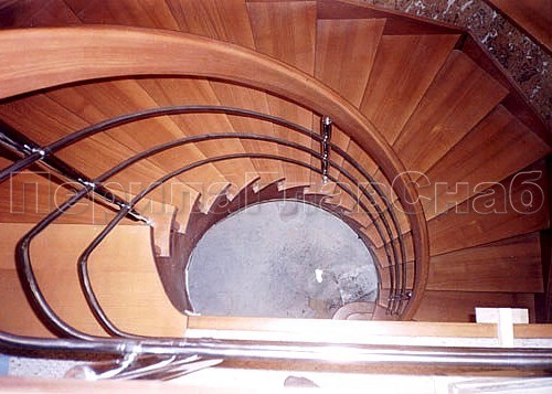 Ограждения со стойками в каждую ступень с круглым деревянным поручнем без ригелей