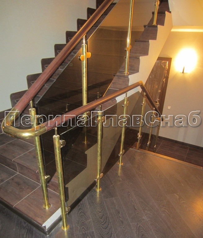 Ограждение лестницы с прозрачным стеклом, стойками и поручнем из латуни в Казани. Готовые проекты ПерилаГлавСнаб - фото 1 Ограждение лестницы с прозрачным стеклом, стойками и поручнем из латуни в Казани. Готовые проекты ПерилаГлавСнаб - фото 2