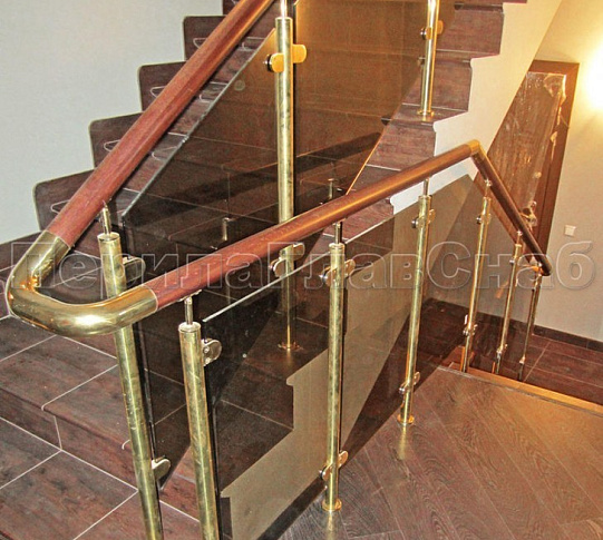Записаться на встречу            Ограждение лестницы со стеклом, тонированным в массе, стойки и завязки поручня из латуни