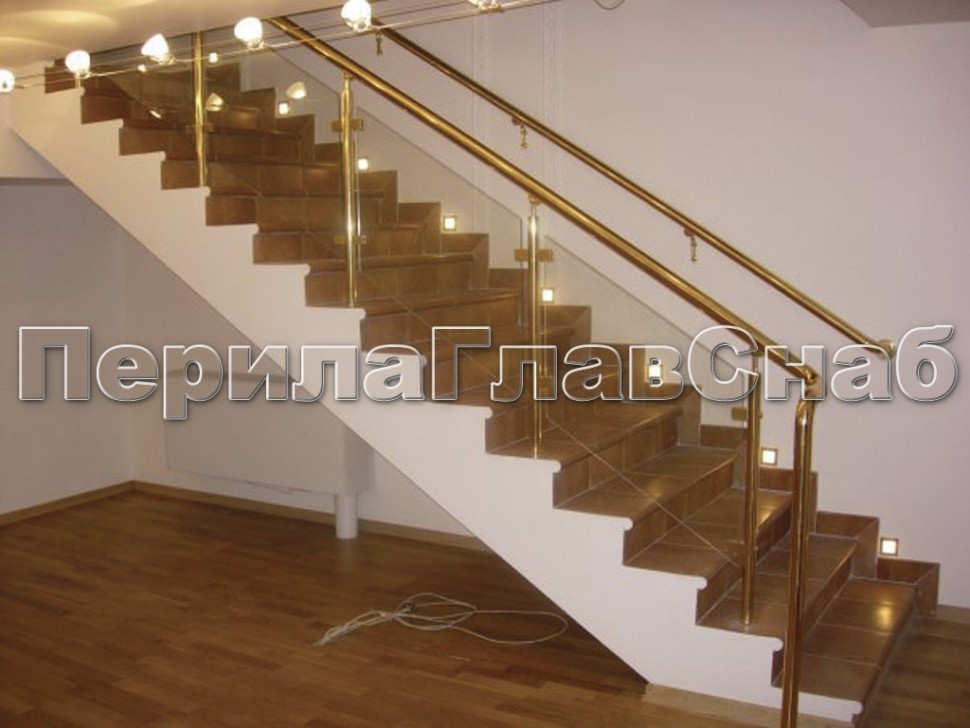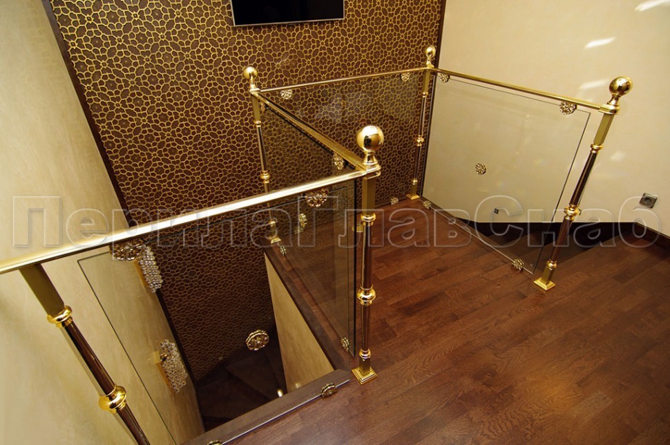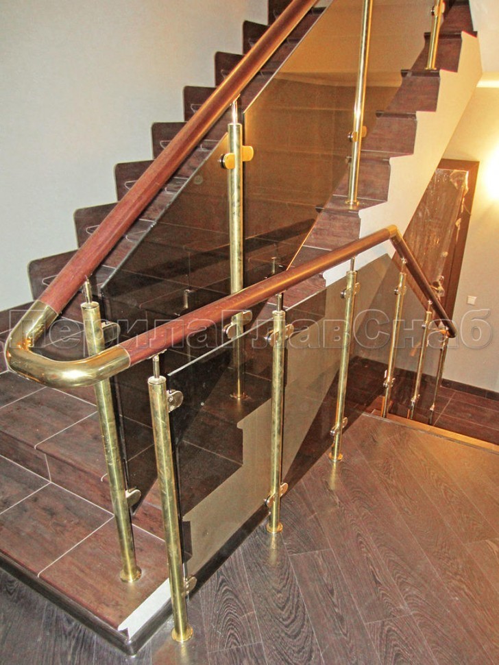 Записаться на встречу            Ограждение лестницы со стеклом, тонированным в массе, стойки и завязки поручня из латуни
