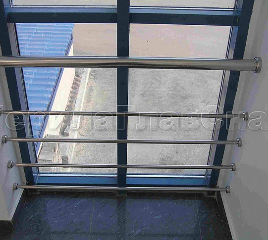 • поручень для ограждения оконого проема может быть из круглой или квадратной нержавеющей трубы: для круглой трубы диаметр оконного поручня может быть - 38,1 или 50мм, для оконных перил с квадратным поручнем - 40х40 мм;