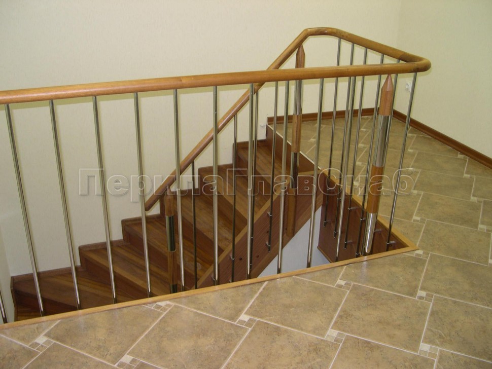 Нержавеющие ограждения без ригелей с круглым деревянным поручнем и стойками с деревянными вставками