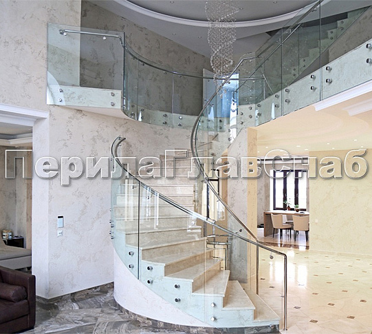 - на выносных держателях к стеклу, прокатан по радиусу на балюстраде, имеет конструкцию винта на лестнице