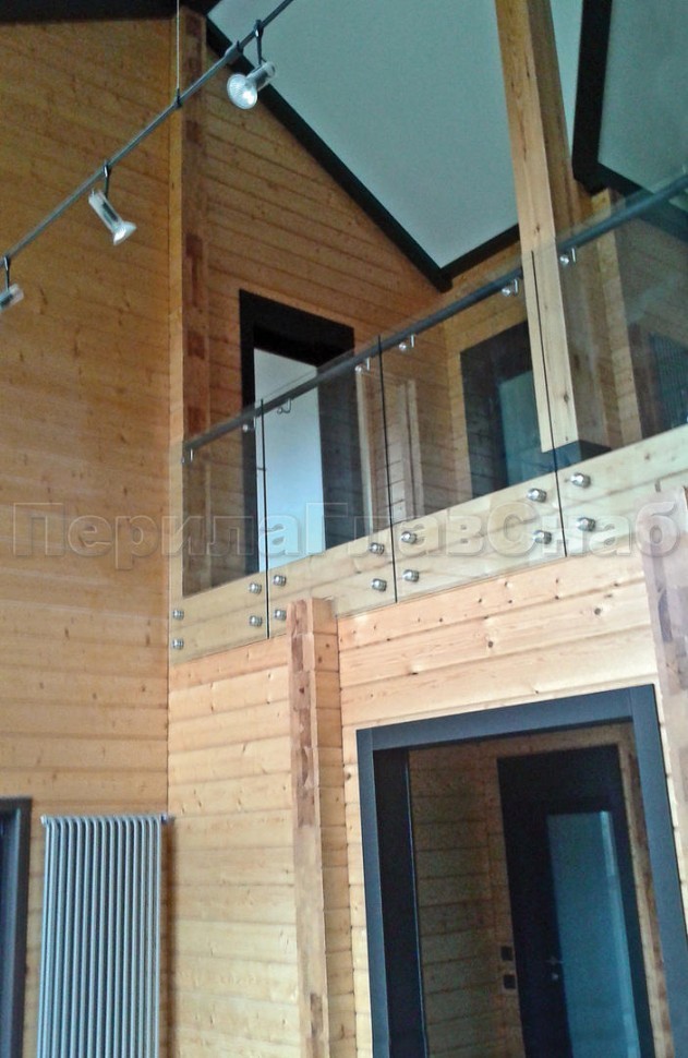 Ограждение с деревянным поручнем на точечном креплении на лестнице