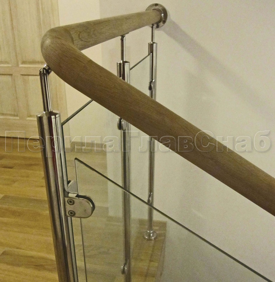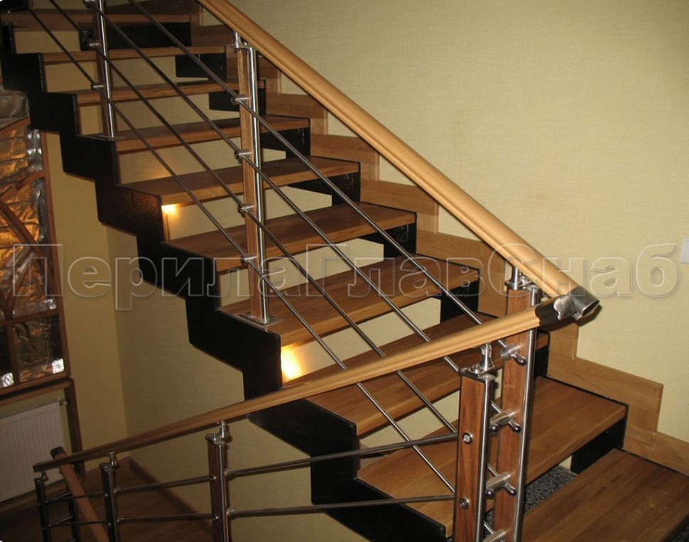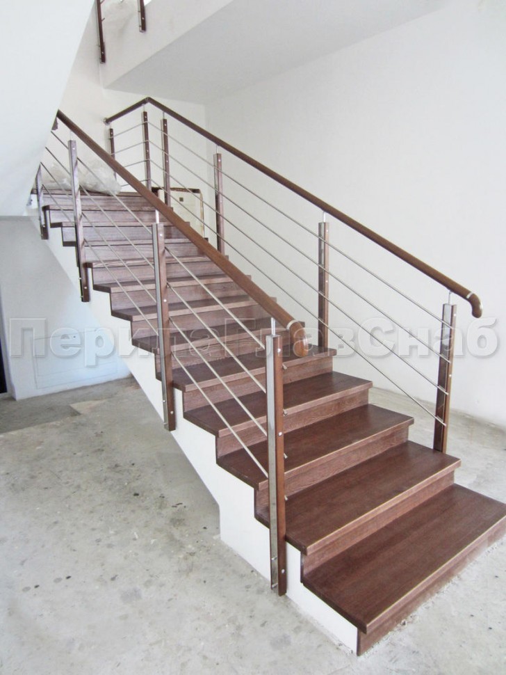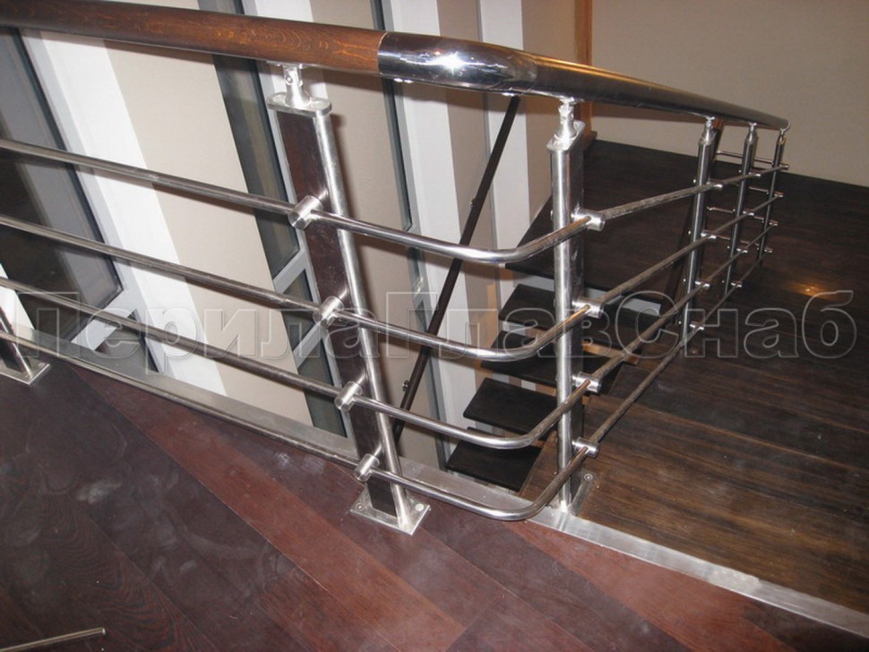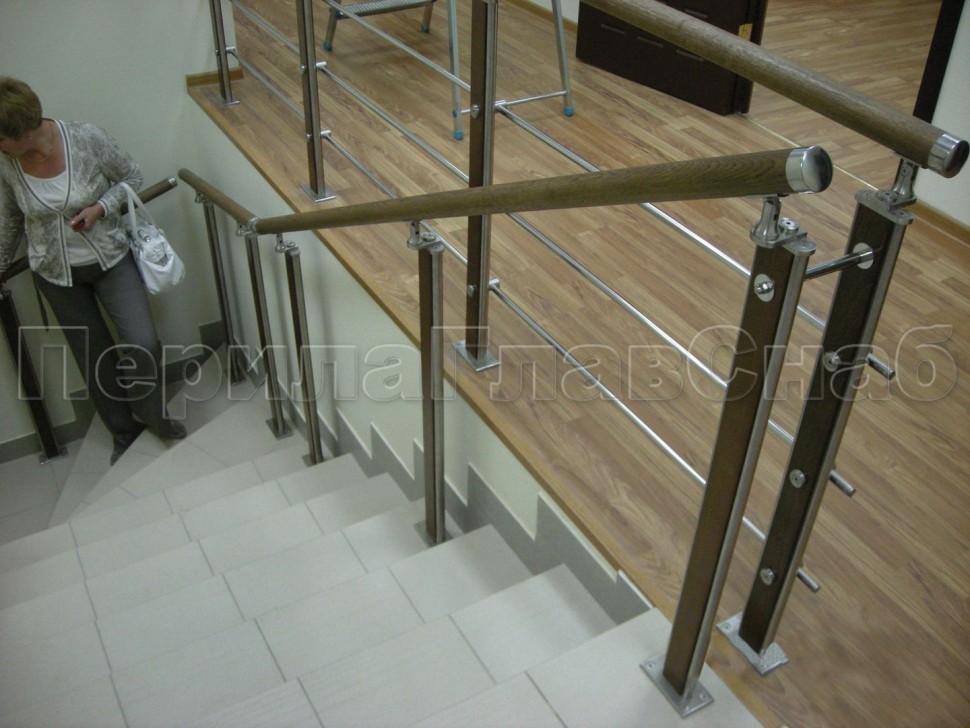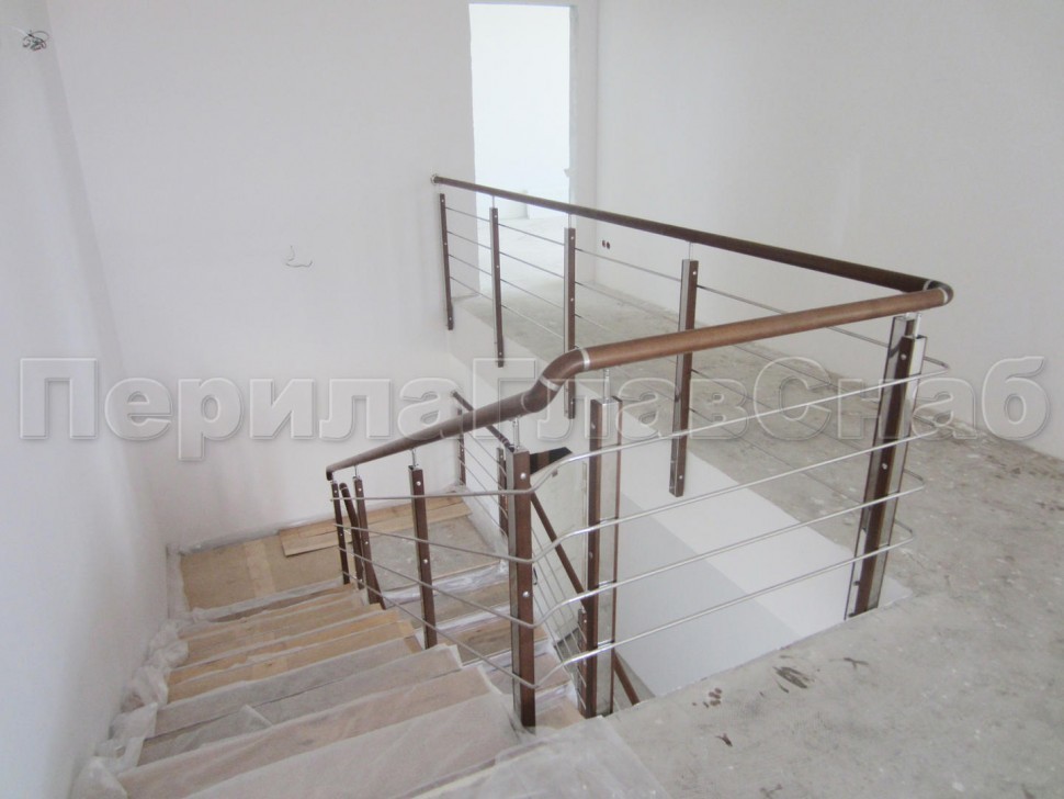 Четыре ригеля на держателях, квадратный деревянный поручень и стойки с деревянными вставками