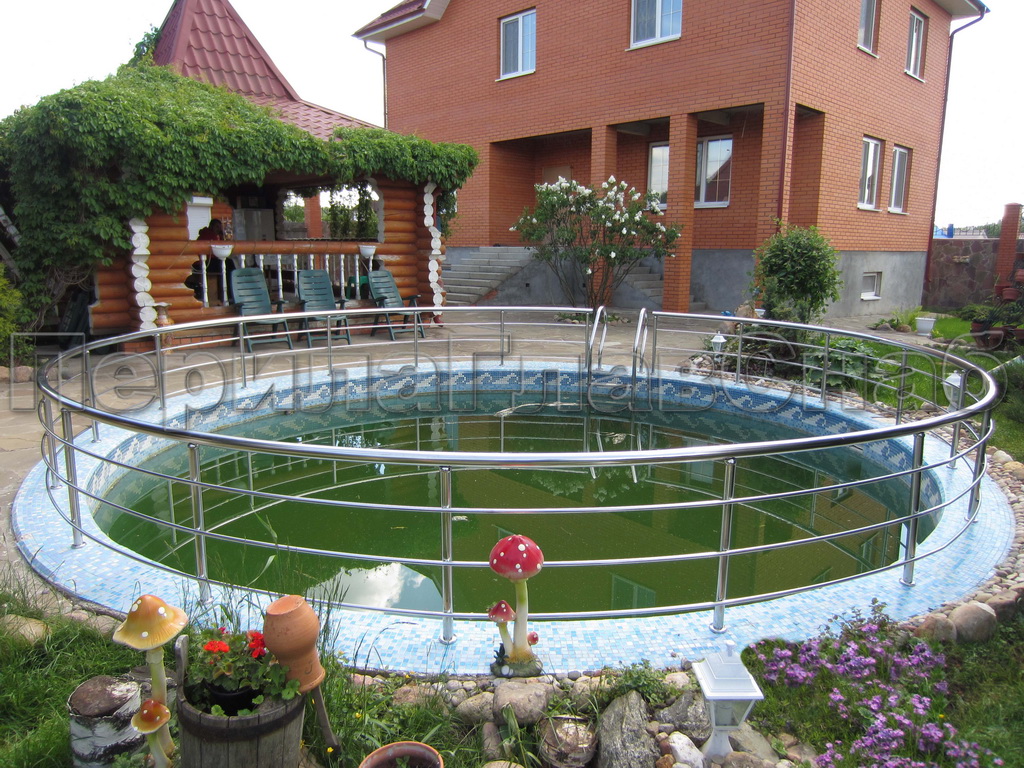 Три ригеля на держателях, круглый поручень и круглые стойки для крыльца