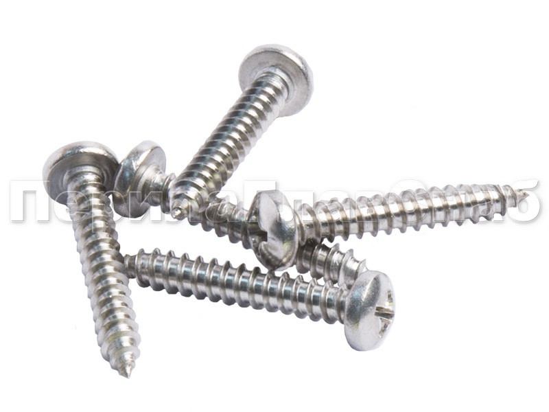 Саморез DIN 7981 ГОСТ 1144 (винт самонарезающий) для крепления тонких металлических листов, с крестообразным шлицем, полукруглая (цилиндрическая со сферой) головка, форма С - с заостренным концом. Нержавеющая сталь А2 типа 12Х18Н9Т