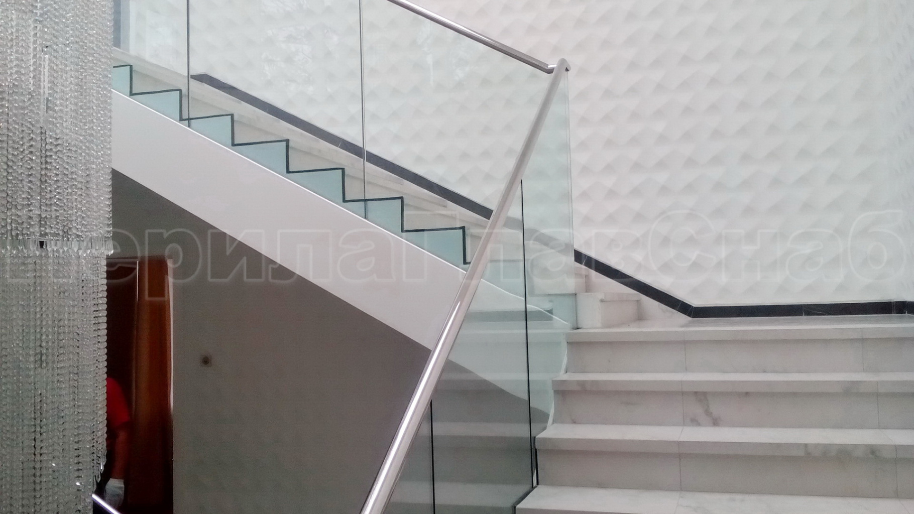 Стеклянные перила на маршевой лестнице в гостиничном комплексе