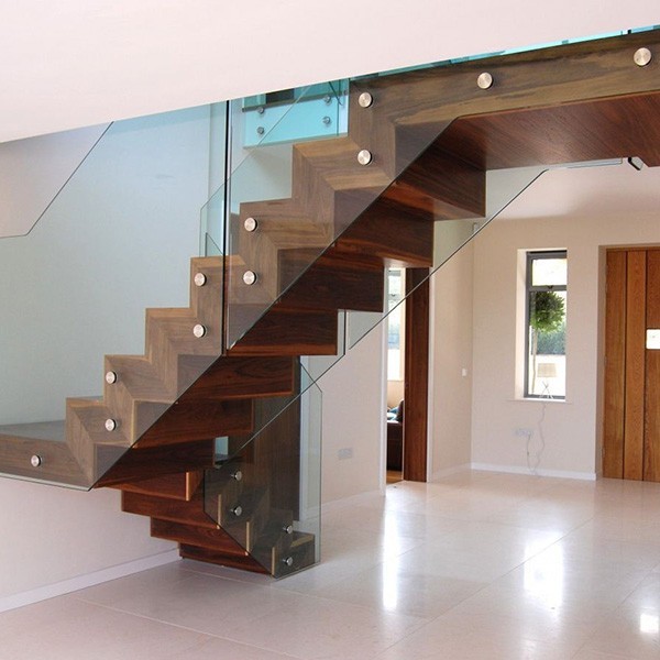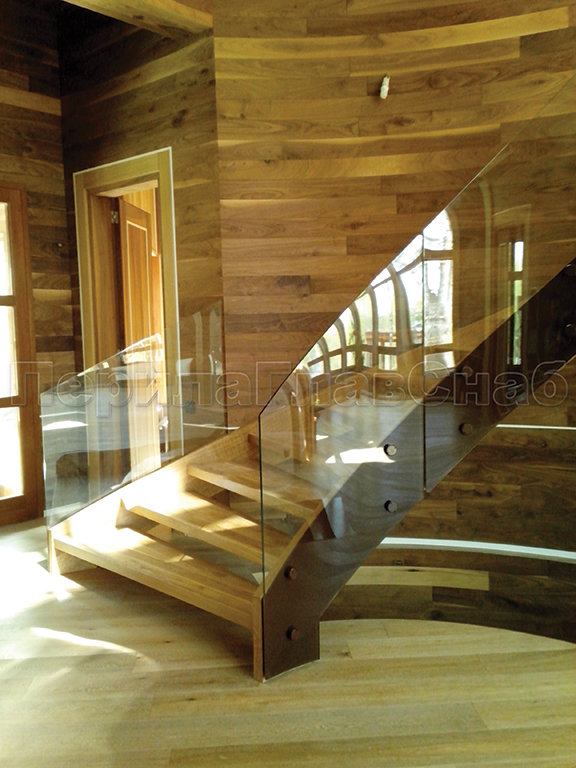 Несущее стекло на алюминиевом профиле с креплением в торец. Профиль скрыт декоративной накладкой под дерево. Очень красивое решение. Под домашний стиль.
