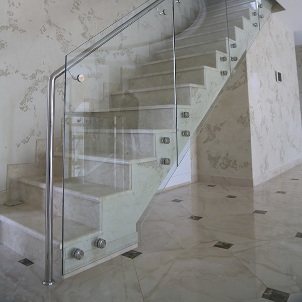 Мы готовы изготовить классическое ограждение лестниц из стекла и нержавеющей стали маршевого типа. Данная конструкция может быть монолитной (например, бетонной), или выполненной на косоурах или больцах. Лестничное ограждение маршевого типа из нержавеющей стали и стекла строится на основе маршей с разным углом наклона. Для облегчения подъема по данной конструкции создаются специальные поворотные плоские площадки, которые могут соединяться забежными ступенями.