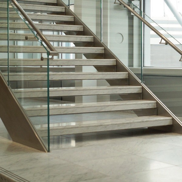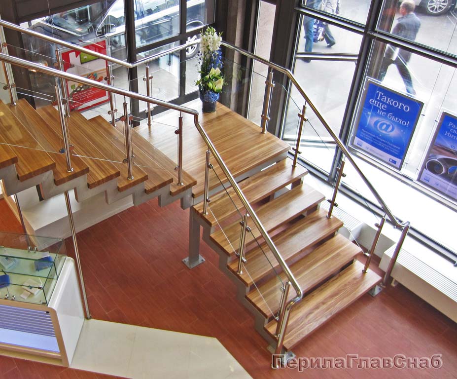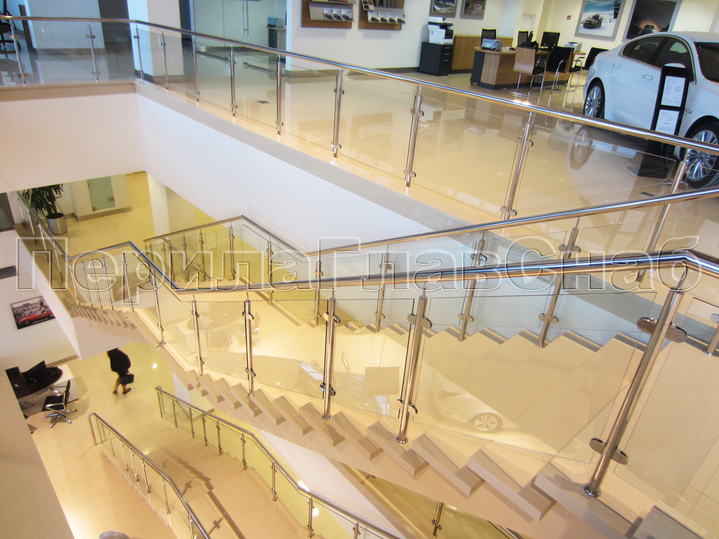 Стеклянные перила для маршевых лестниц в офисном здании.