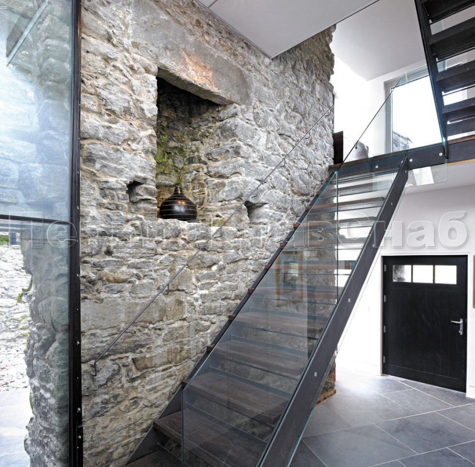 Ограждение без поручня на точечном креплении на лестнице