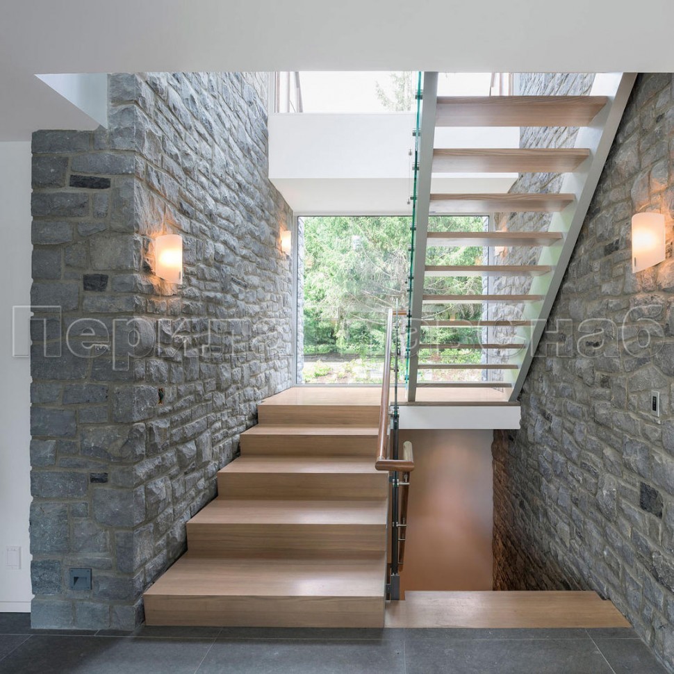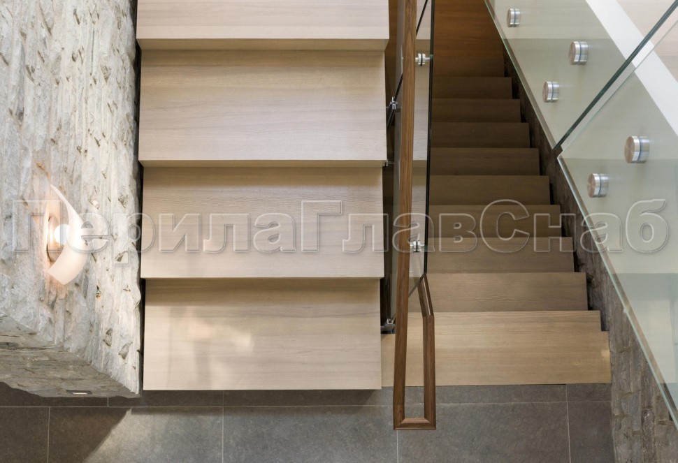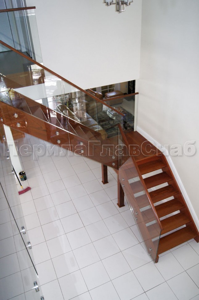 Ограждение с деревянным поручнем на точечном креплении на лестнице