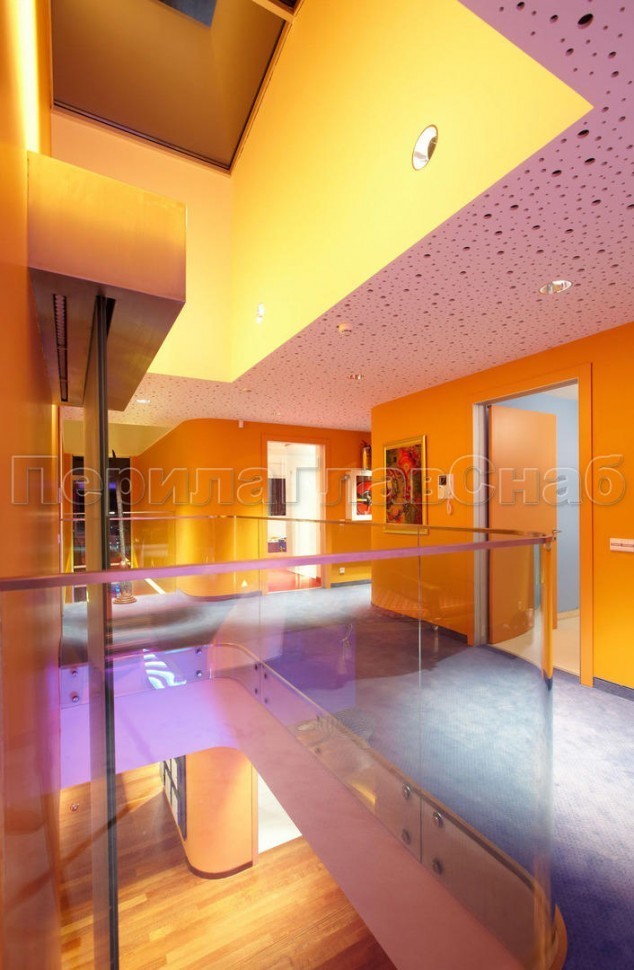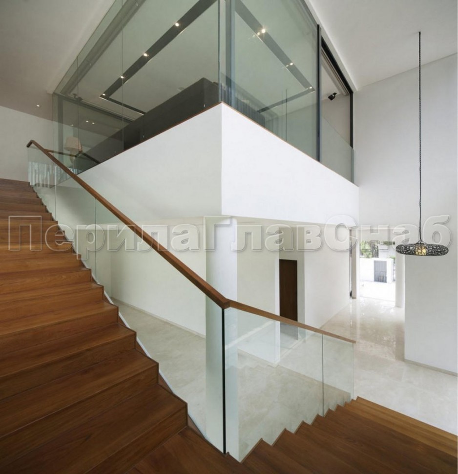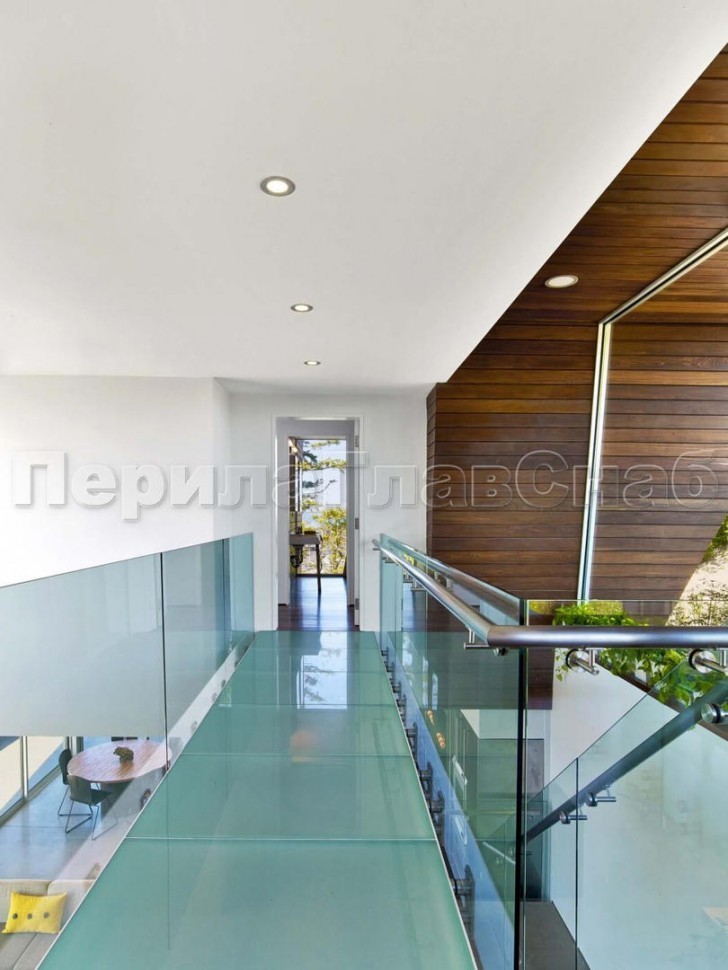 Красивая опция - частичная матировка нижней части несущего стекла (делают обычно там, где стекло примыкает к лестничному маршу или перекрытию).