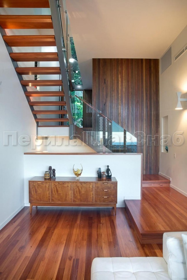 Ограждение с деревянным поручнем на выносе на точечном креплении на лестнице