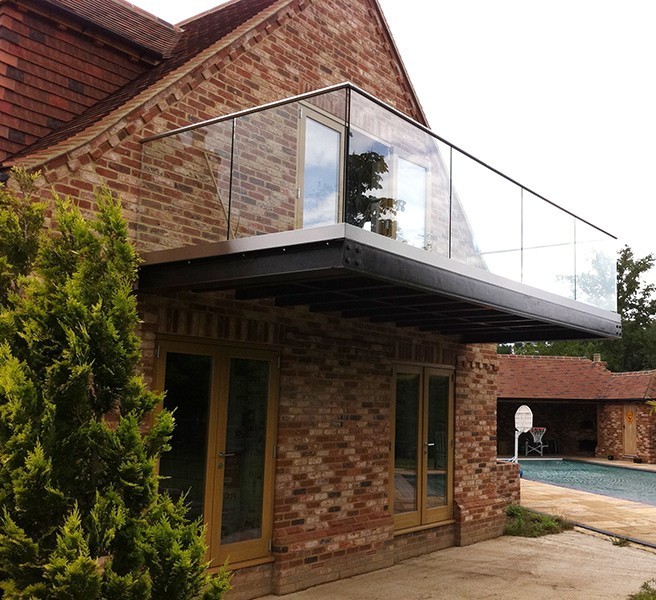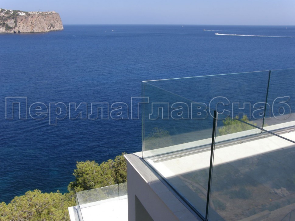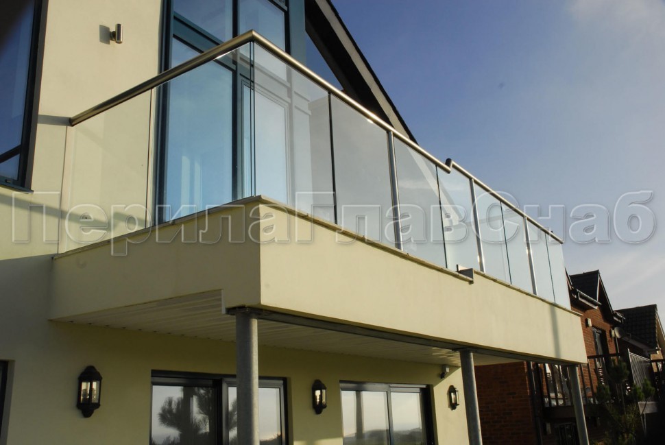 Данный тип ограждений в своей конструкции стоек не содержит. Несущие функции выполняет толстое каленое стекло. Само же несущее стекло крепится к балконной плите на алюминиевый профиль, который способен выдержать очень большие нагрузки, поэтому очень надежный.