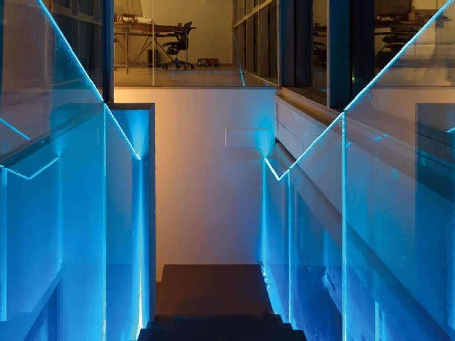 Хорошее практическое применение дает подсветка в дополнительном выносном поручне. В таком виде подсветки хорошо освещаются как поручень и стекло, так и ступени или внутреннее пространство, огражденное стеклом. Очень часто различные виды размещения комбинируют, например, используют подсветку в профиле и подсветку в дополнительном поручне.