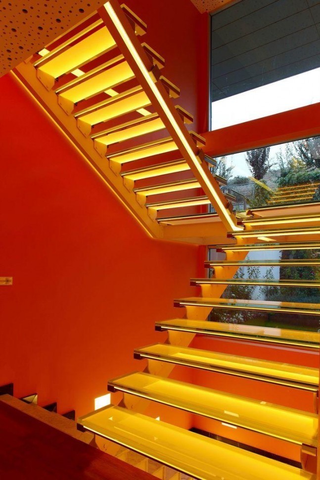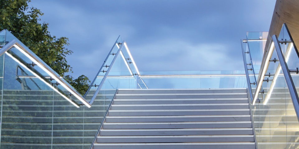 Ограждения лестниц на несущем стекле с подсветкой