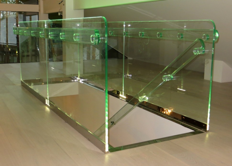 Для создания эффекта объемного свечения всей поверхности несущего стекла используйте матовое стекло (матирование либо химическим травлением, либо пескоструйкой). Неровности, рассеивающие свет с поверхности стекла, создадут иллюзию цельносветящейся стеклянной панели. Очень красиво смотрятся барные стойки, сделанные из несущего триплекса со спрятанным в полу усиленным несущим профилем.