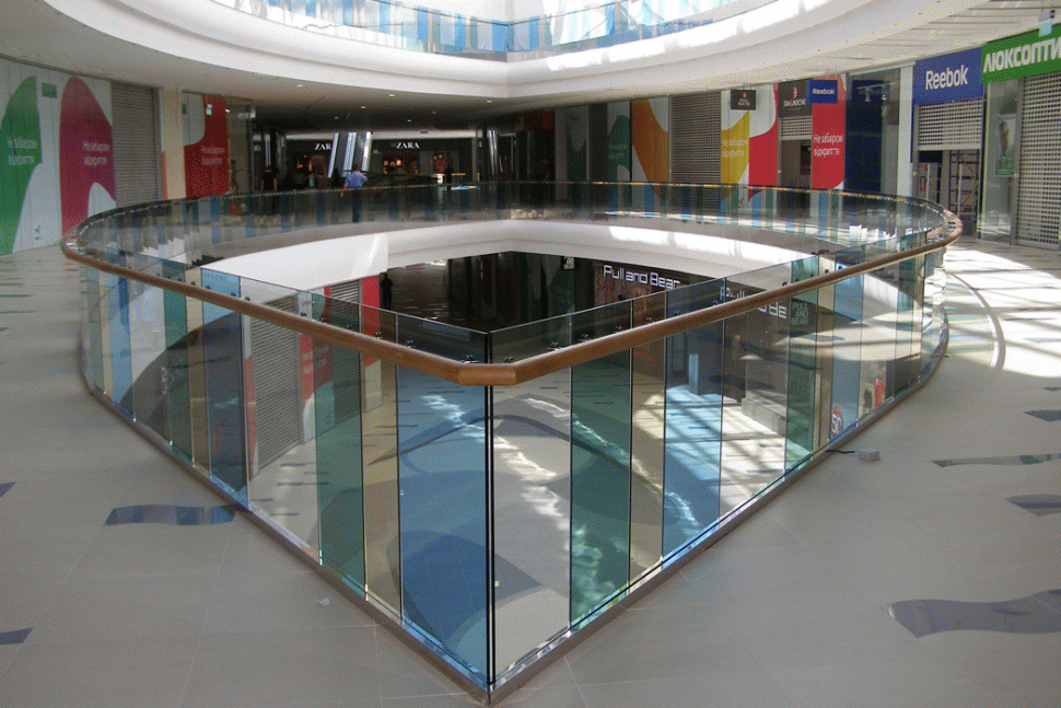 Ограждение с профильным поручнем с пазом на точечном креплении на лестнице
