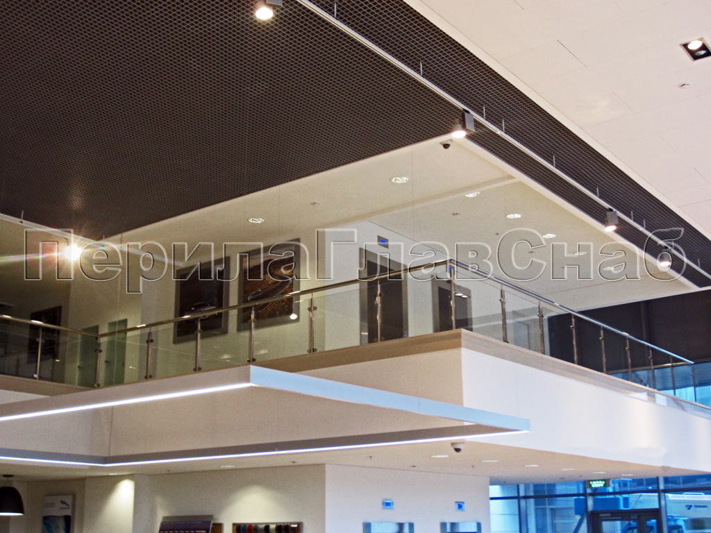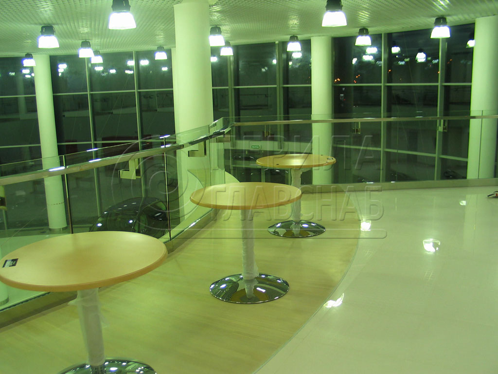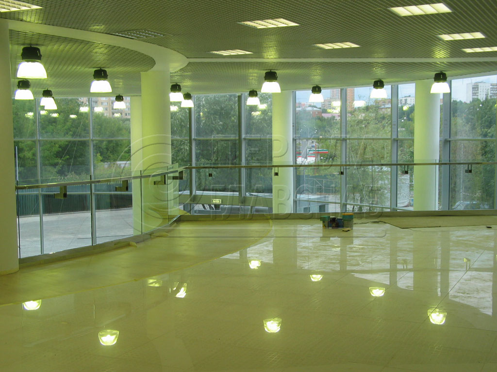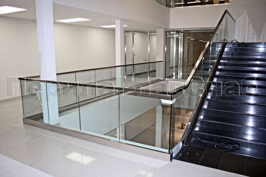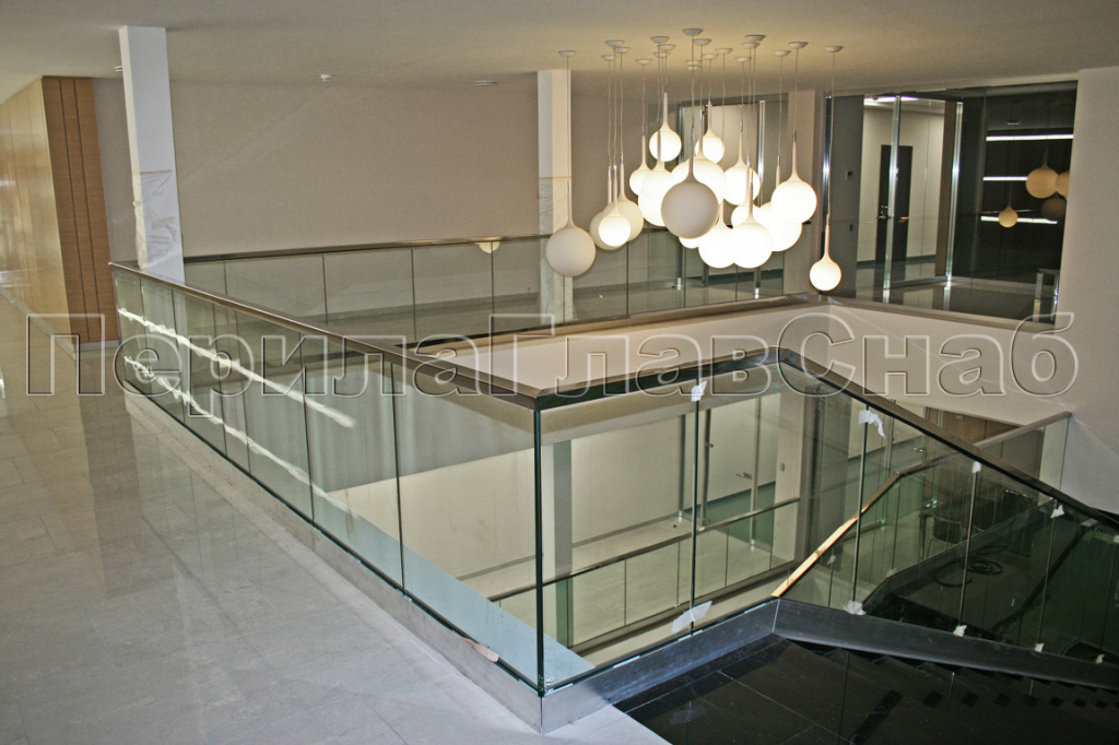 Несущее стекло для атриума установлено на алюминиевый анодированный профиль. Преимущества такого профиля в том, что он обладает зеркальным блеском, крепится на анкера и обладает огромной надежностью (выдерживает очень большие нагрузки и на разгиб). Для комфорта посетителей был использован поручень из трубы с пазом. Труба с пазом - идеальный поручень для несущего стекла,удобна в эксплуатации, а так же защищает кромку стекла.
