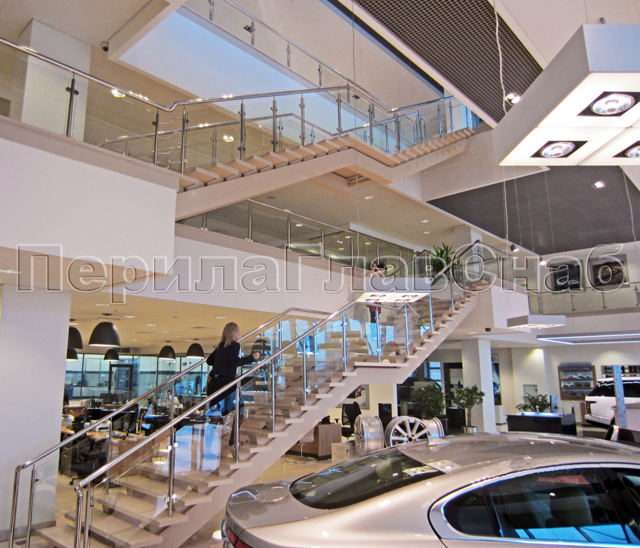 Наиболее удачные решения готовых стеклянных перил в бизнес- и торговых центрах.