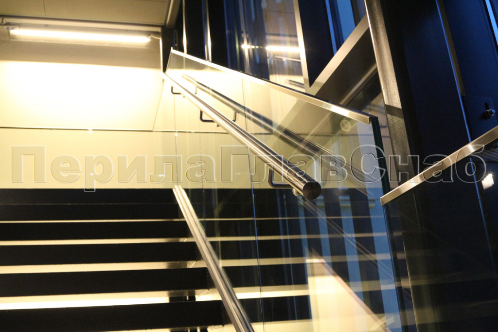Ограждения лестниц на несущем стекле с подсветкой в Казани. Готовые проекты ПерилаГлавСнаб