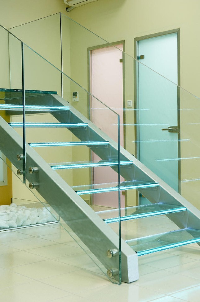 Стеклянные ступени и стеклянная площадка на лестнице в Казани. Готовые проекты ПерилаГлавСнаб