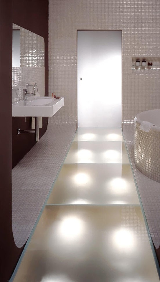 Стеклянные полы с подсветкой. На фотографиях стеклянного пола видно, что может быть либо встроена под прозрачные плиты. Этот способ используется если пол изготавливается как элемент декора и не выполняет функции перекрытия. Такой прием можно использовать для стеклянные потолков или полов например на кухне или в спорт зале или в гостиной (ваша гостья будет приятно удивлена вечером такой иллюминации пола). Если же стеклянная плита или стеклянные блоки я вляются межэтажным перекрытием, то для подсветки стекла используются светодиоды и они встраиваются в торцы стеклянных блоков. Для подсветки стеклянных ступеней или стеклянных межмаршевых площадок используется светодиодная лента.