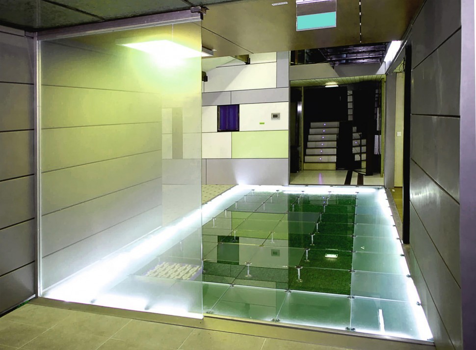 Стеклянное перекрытие из матового стекла на внутреннем балконе