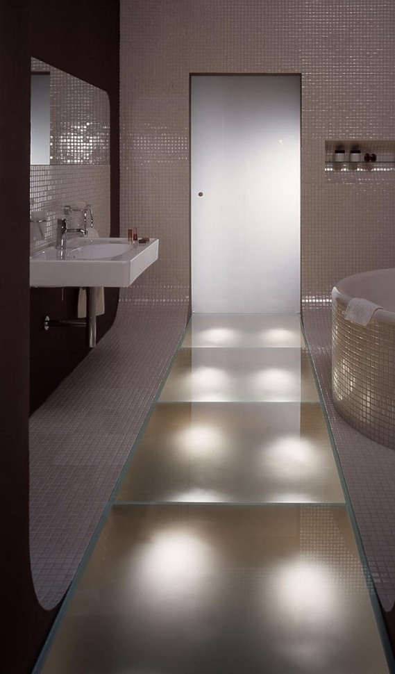 Полы из стекла для ванной комнаты сочетают в себе декоративную выразительность, надежность и удобство в уходе, легко адаптируясь к напольным покрытиям любого стиля.