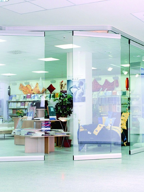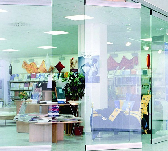 Стекло фиксировано в алюминиевом профиле с точечным креплением к полу и потолку.
